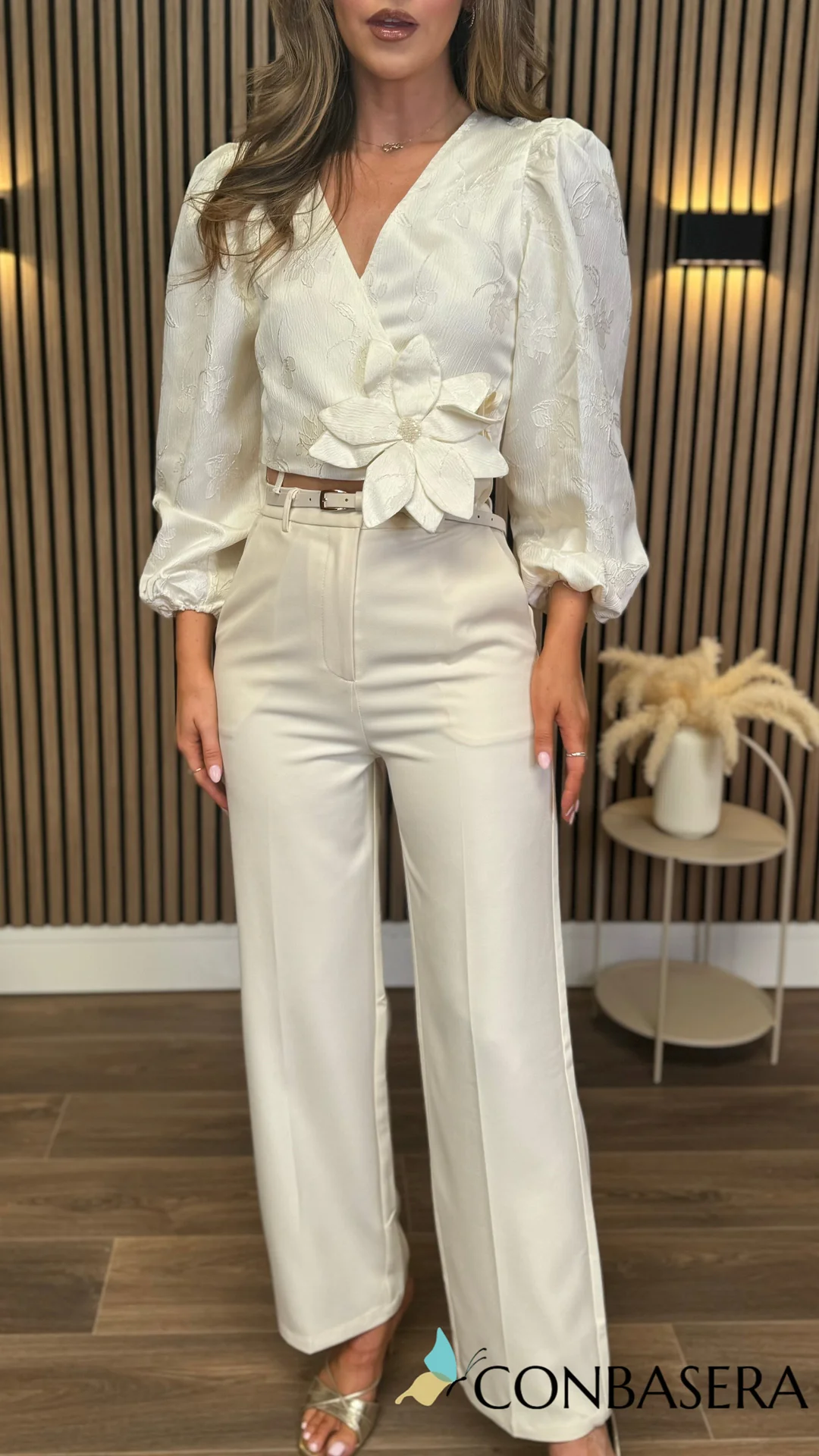 Embrace a playful charm with this Candy Cream V Neck Long Sleeve Top. Featuring a flattering wrap effect and a delicate jacquard print, it’s adorned with an eye-catching 3D flower that add a touch of whimsy. The elasticated cuffs keep the sleeves comfortably in place, making it perfect for dancing through your day with style and ease.