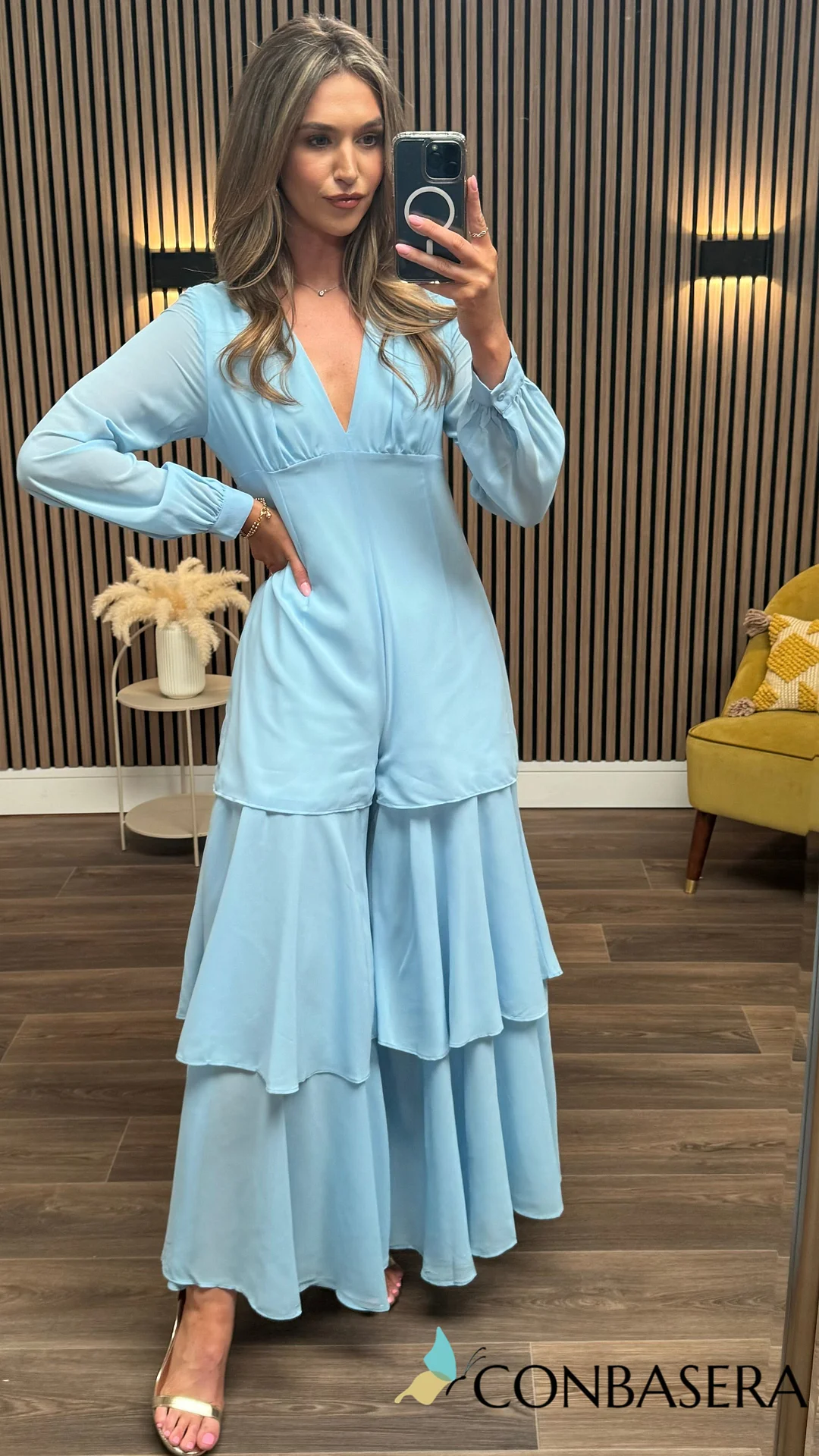 Get ready to turn heads in the Lizzie Blue Maxi Jumpsuit! This playful chiffon jumpsuit features a v neckline, long sleeves, and frill and slit details for a fun and flattering look. Fully lined for comfortable wear, button cuffs and a concealed zip back fastening for easy on and off.