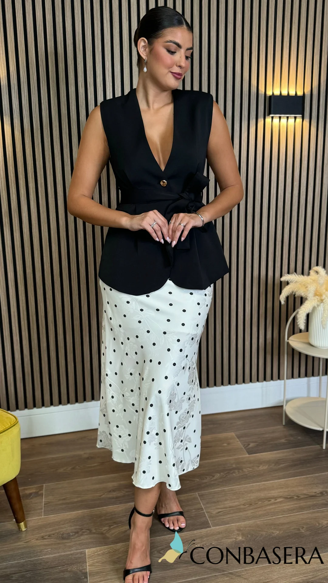 This Olive Beige & Black Polka Dot Skirt features elegant floral details that enhance its timeless charm. The refined pattern and subtle design make it an ideal choice for sophisticated occasions, offering a graceful silhouette and versatile style that transitions effortlessly from day to night.